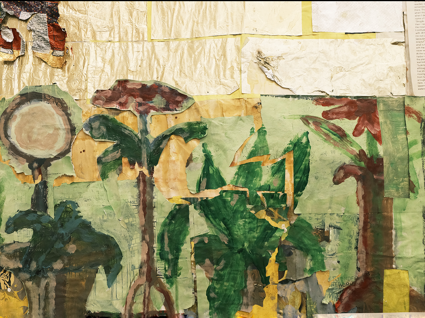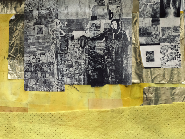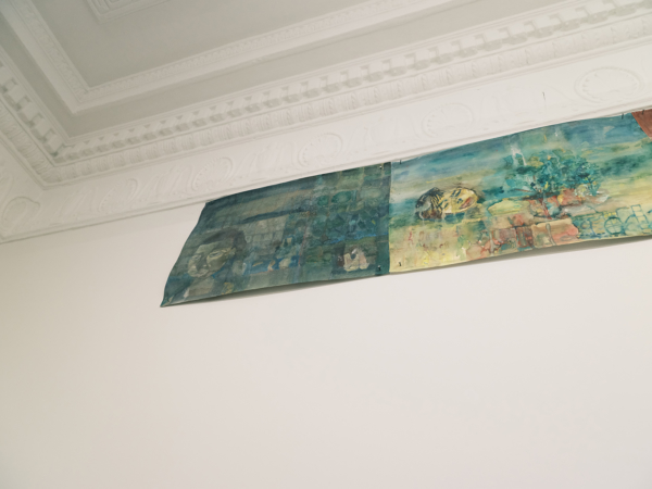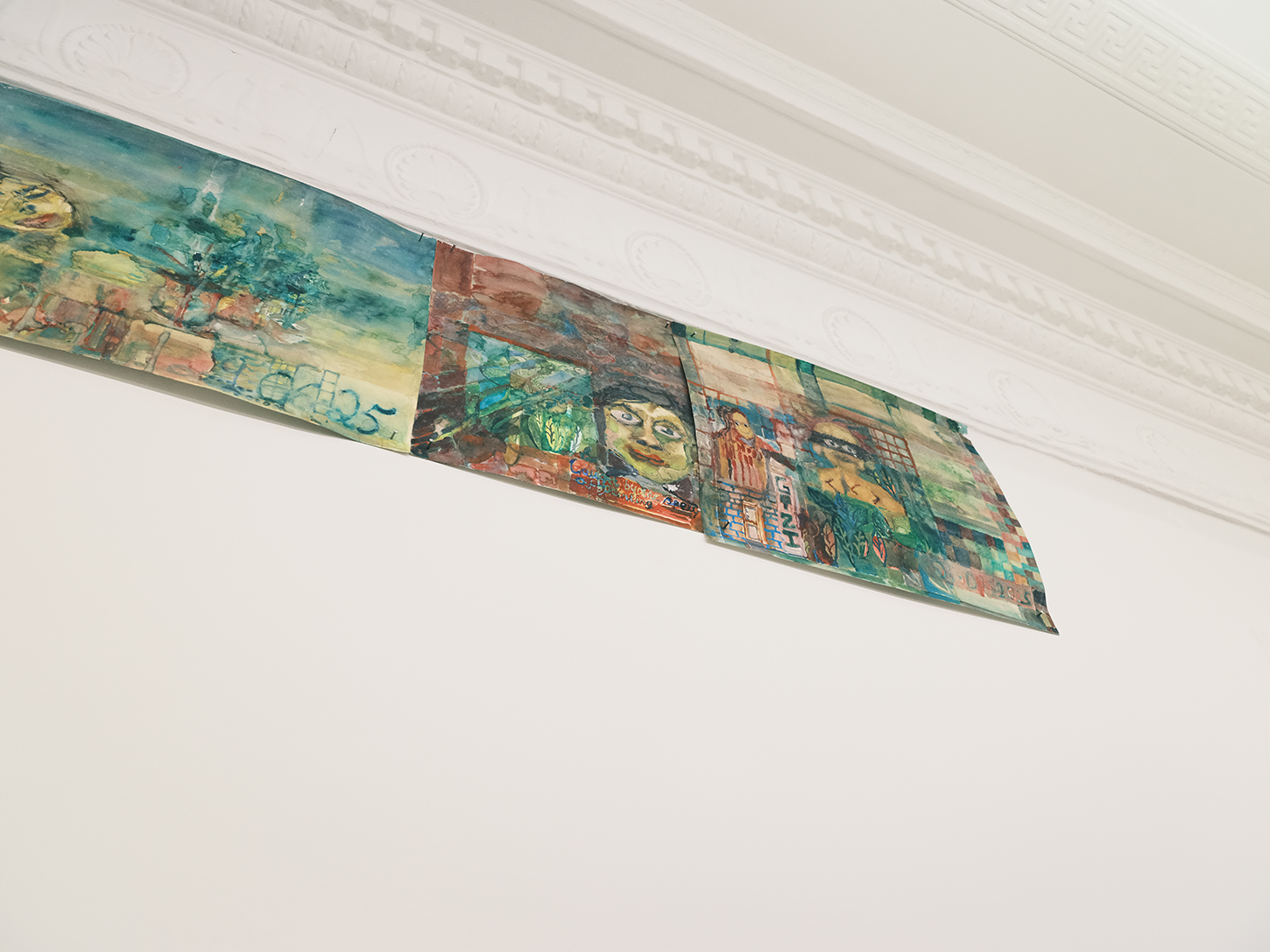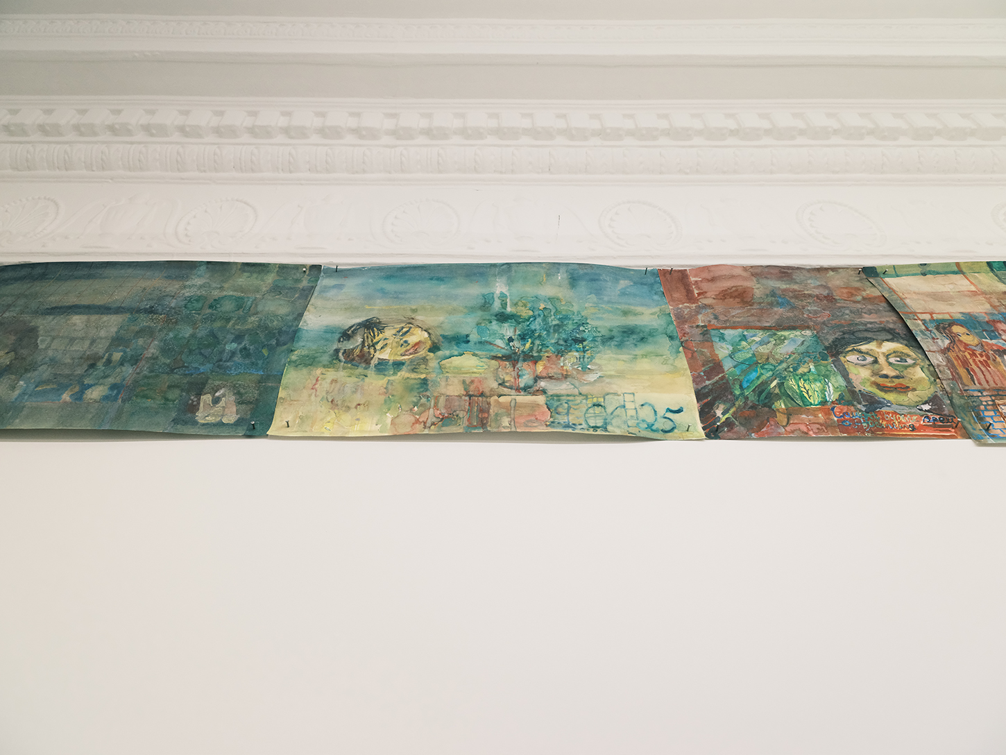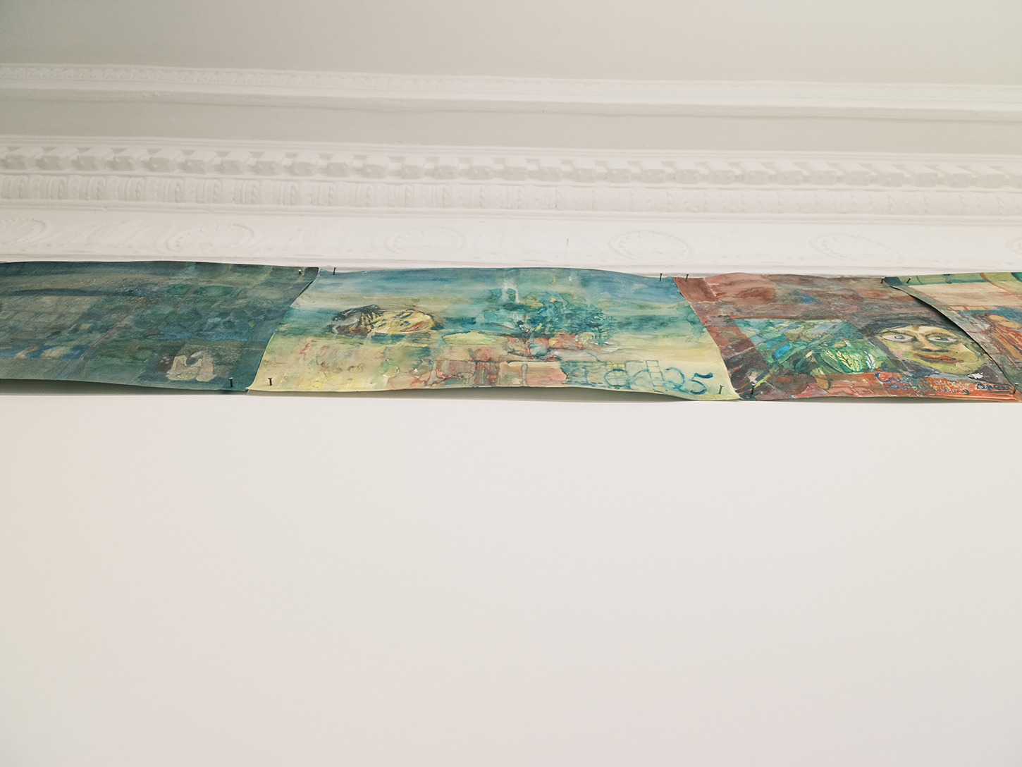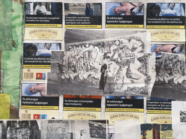 Their seemingly frivolous appearance quickly gives way to more somber expressions of angst and violence, as well as to moments of humor. The largest frieze displayed in the office turns out to feature interlude scenes from 1970s porn magazines purchased in Athens—sex scenes omitted and discarded, save for one final pornographic image that Lizana has kept but still refuses to display.
