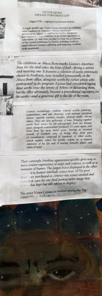 A couple months ago, Victor Lizana presented an exhibition titled Anabasis at Aristotelis Nikolas Mochloulis’ apartment in Athens. A couple years earlier, Mochloulis had organized a solo exhibition in his former apartment at Lomvardou 34, and since moving to a new one at Solomon 64 has hosted exhibitions by friends, including Anabasis, which followed Lizana’s subletting and temporary residence in the apartment.